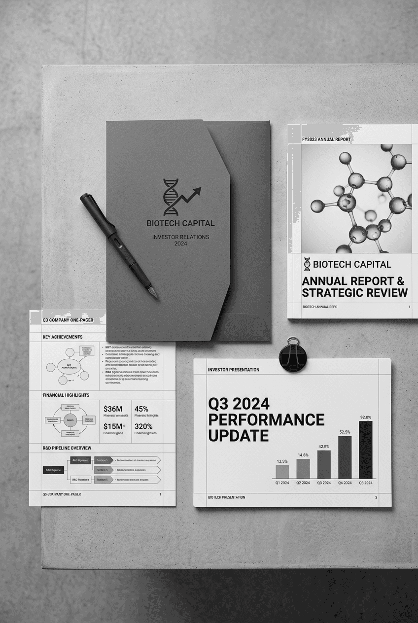 Biotech companies building a complete communications materials system for conferences and beyond should review biotech investor communications design for the investor-facing materials that complement conference presence, and biotech brochure design for the detailed print collateral strategy. The brand identity foundation that all conference materials should express is covered in life sciences brand identity.