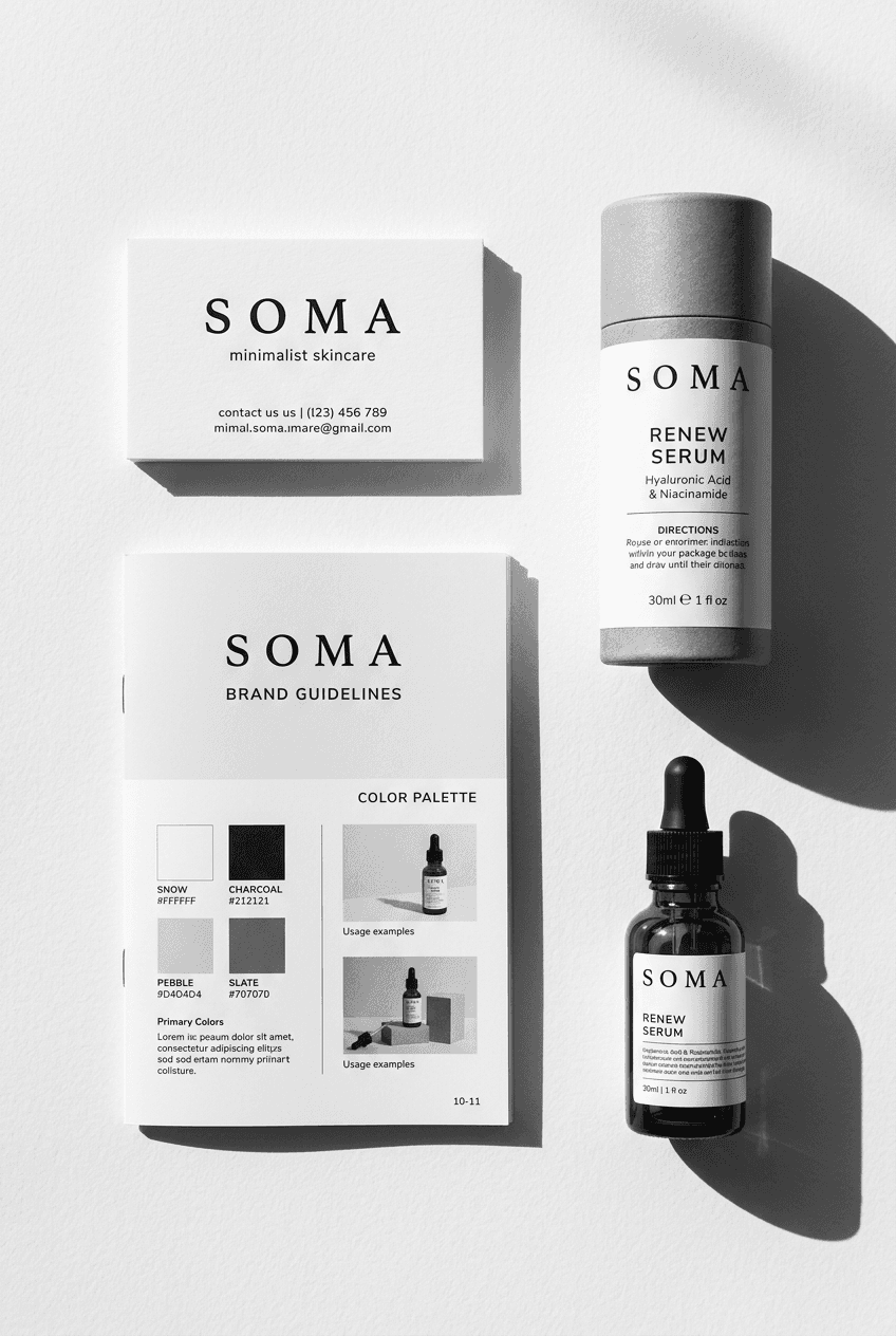 A complete skincare branding project includes brand strategy and positioning, visual identity (logo, color palette, typography, brand marks), packaging design for the specific container formats in the range, brand guidelines, and in many cases copywriting guidance for claims. Website design and development, photography, and trademark registration are typically separate costs.